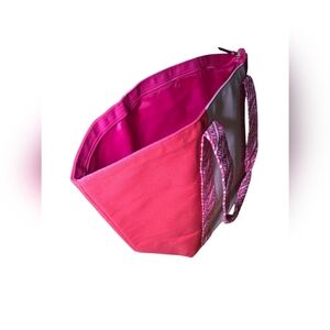 The tote features a pink handle and strap, as well as pink hardware, adding a touch of classic elegance to the design. The interior is lined with polyester and also features a pink color, ensuring that your belongings stay organized and easy to find. Whether you're headed to the beach, going on a weekend getaway, or just running errands, this tote is the perfect choice for any occasion.
