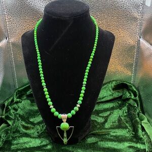 A vibrant, earthy statement necklace and earrings crafted with rich green Gaspite beads and a sculptural sterling silver pendant. The gaspite displays beautiful natural variation—bright apple to lime greens with subtle mottling—giving the pieces depth, character, and an organic, collected feel.