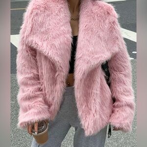 Stay warm and stylish with this luxurious pink faux fur coat. Perfect for adding a touch of elegance to any outfit.