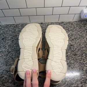 Sorel platform sandals with a tan leather upper. Features adjustable straps and a sturdy sole.