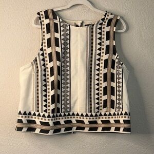Stylish sleeveless blouse. Features geometric patterns. Perfect for casual or office wear.