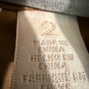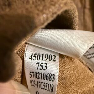 Stylish tan leather jacket by Chico's. Features gold button details and zippered pockets. Ideal for versatile wear. Chico’s Sz 2, equals 12/14.