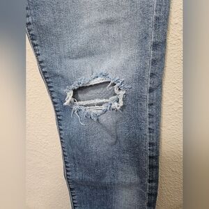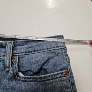 These are in great used condition. intentional distressing and frayed raw hem legs. cotton blend allows some stretch to material. medium wash denim. high rise high waist with button fly and straight leg. very cute and trendy. measurements in pictures.
