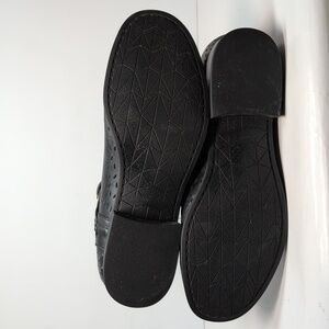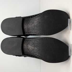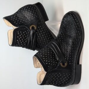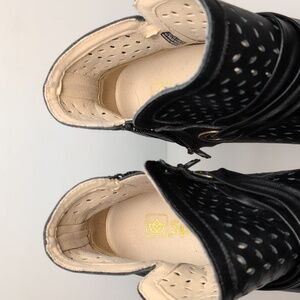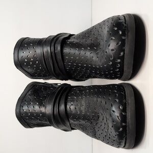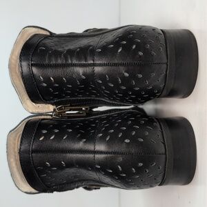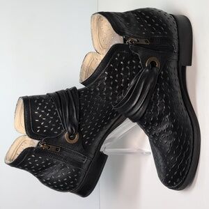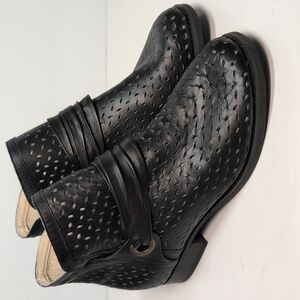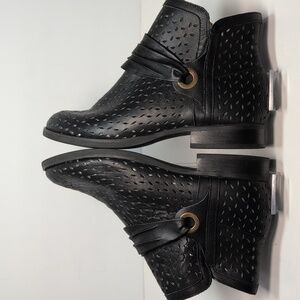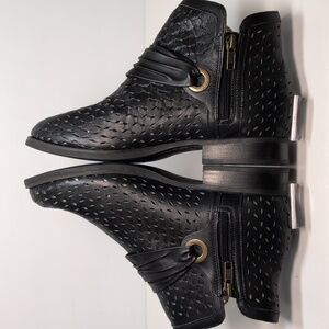 Stylish black ankle boots with perforated design. Features a unique strap detail.
