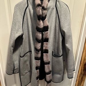 Stylish black coat featuring luxurious fur trim. Perfect for a sophisticated look.