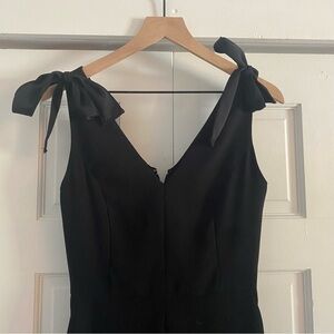 Chic black jumpsuit. Features stylish bow accents on straps. Ideal for versatile wear.