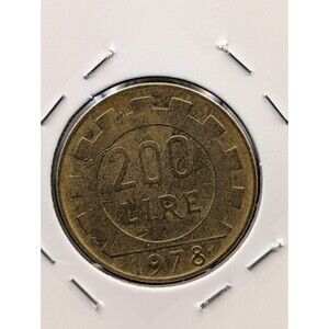 1978 Italy 200 Lire coin featuring the classic gearrim design and portrait of Minerva. A staple late20thcentury Italian issue, offered in circulated condition exactly as shown.