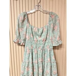 Row A Green Floral Mini Dress, Smocked Tiered Fit, Pouf Sleeve Women's Size S
