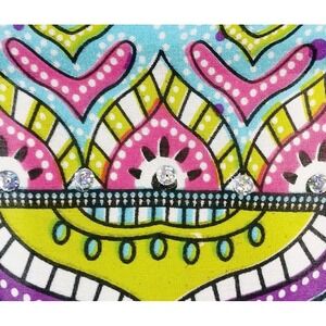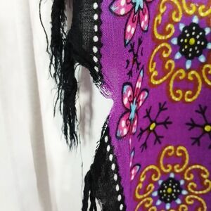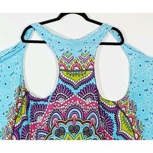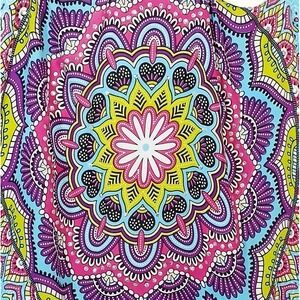 Vibrant bohemian mandala-print kimono swimsuit cover-up featuring a colorful, intricate center motif on a turquoise background. This flowy, boho-chic piece includes a unique racerback cut and black fringe trim, making it perfect for the beach or as a lightweight festival layer. Crafted from breathable, soft fabric, this one-size versatile cardigan adds an effortless pop of color to any summer outfit