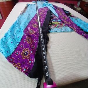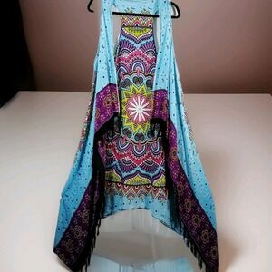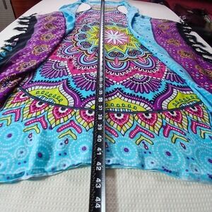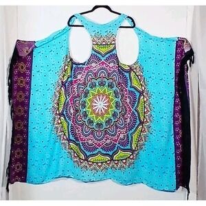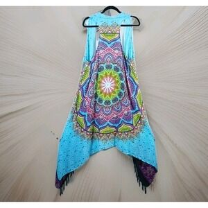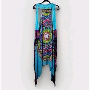 Mandala Kimono Beach Cover-Up Fringe Boho Hippy Multicolor Icy Blue One Size