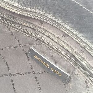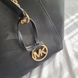 Elevate your ensemble with this chic and timeless Michael Kors Jet Set shoulder bag, a pinnacle of sophisticated design. Crafted from durable Saffiano leather, its architectural silhouette is both luxurious and practical, featuring convenient side pockets for effortless organization. The opulent, gleaming gold-tone chain details on the straps add a touch of glamour, ensuring this versatile black tote transitions seamlessly from a busy workday to an elegant evening out. This piece is an essential accessory for the modern, fashion-forward individual. note in last picture there is a small (pencil erasure size) mark.