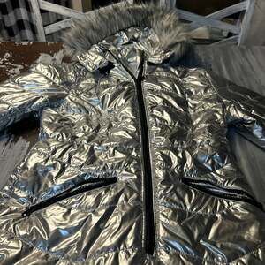 Kultivate Metallic Silver Quilted One-Piece Snowsuit. This striking winter outfit features a high-shine silver exterior with horizontal quilting for insulation.