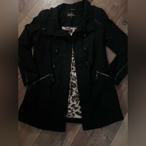 Chic black trench coat with double-breasted design. Features zippered pockets and stylish Cheetah print lining. In Great condition.