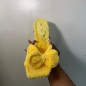 Bright yellow fuzzy heels. Add flair to your look. Comfortable and stylish.