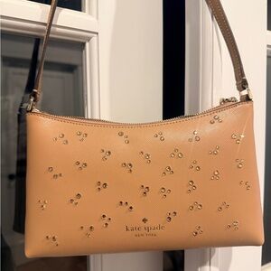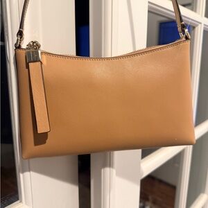 Stylish Kate Spade clutch in tan. Features gold embellishments. Perfect for any occasion.