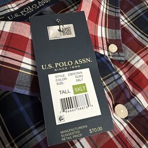 The US Polo Assn NWT Men's 5XLT Plaid Long Sleeve Button Up Shirt is a stylish and versatile addition to any man's wardrobe. Made from a blend of polyester and cotton, this shirt offers a relaxed fit for added comfort. The classic plaid pattern and collared neckline give it a timeless and preppy look, perfect for various occasions including casual outings, workwear, and even a party or travel. With easy care instructions and all-season features, this shirt is a practical and fashionable choice for the modern man.C72
