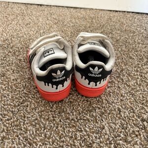 Adidas kids sneakers with a white base and bold red trim. Features easy velcro straps. Ideal for active play.