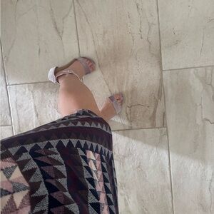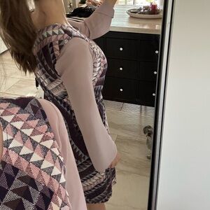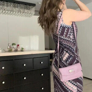 Geometric patterned dress in beautiful purple tones. You can layer it! Very stretchy. Lined. Rayon and spandex. 19” across bust and 40” long. I normally wear a small, this fits oversized for me. Coordinating purse in another listing.