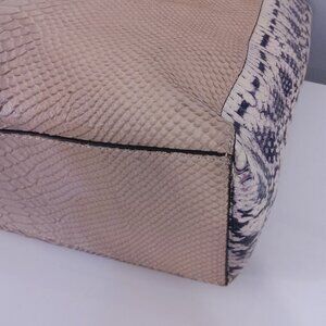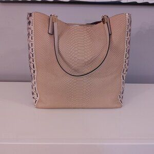 Beautiful light pink & cream leather Coach bag with snakeskin feel and print. There is barely any wear on the bottom corners but the inside is starting to peal. I may have carried this bag one time. Measurements 13" x 13".
