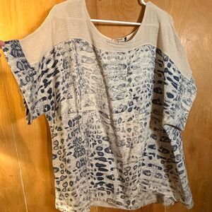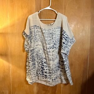 Elevate your wardrobe with this beautiful Lungo L'Arno top! This Italian-designed piece features a soft beige/cream knit yoke and short sleeves with ribbed texture, paired with a flowing all-over abstract animal print (mixed leopard spots and snakeskin/marbled motifs in navy blue, gray, and ivory tones) on lightweight, semi-sheer woven fabric—likely a linen blend or cotton/viscose for that breezy, effortless feel.