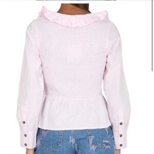 Elegant lilac top with ruffled details, perfect for any occasion. 100% certified organic cotton. Form fitting silhouette, square neckline with ruffled edges, smocked bodice with long sleeves and buttoned cuffs. Color is lilac but looks more to be a pale pink. Smoke free home. New without tags