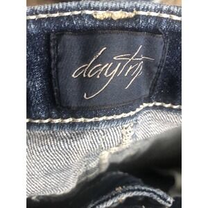 These are women's bootcut jeans from the brand Daytrip, featuring a solid blue denim fabric with a medium wash. They have a zip closure, 5-pocket design with flap back pockets, and a regular fit. Made of polyester, spandex, and cotton, they have a mid-rise waist and a 28-inch waist size. The inseam measures 33 inches, and the size is 28 in a regular fit.