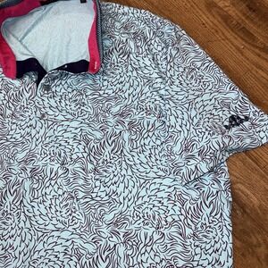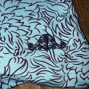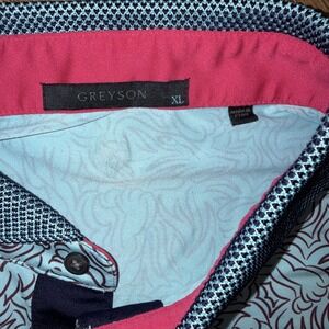 The Greyson Den Of Thieves Polo Golf Shirt in size XL features a stylish design with a striking Daniel Island Club logo on the sleeve in skytone blue color. Made from a blend of polyester and spandex, this regular fit polo shirt is perfect for golf enthusiasts looking for a comfortable and stretchy fabric that allows for ease of movement on the course. With a collared neckline and short sleeves, this shirt is ideal for outdoor activities and sports-themed occasions, making it a versatile addition to any man's wardrobe.
