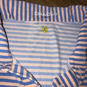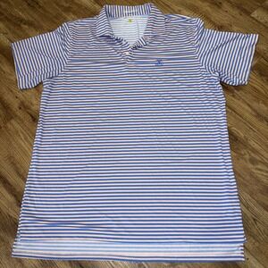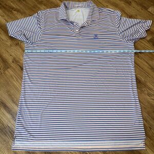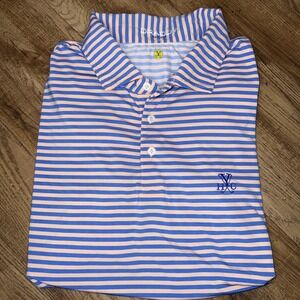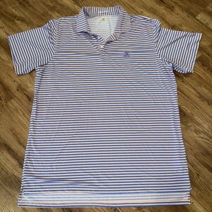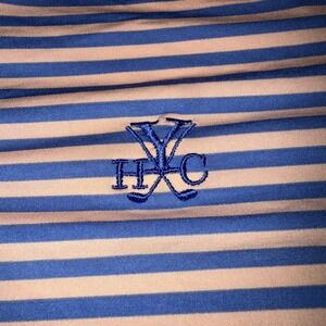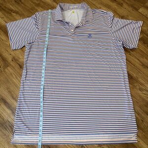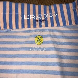 The Yeeman's Hall Club B Draddy Sport Golf Shirt in peach-blue stripe XXLarge is a stylish and comfortable top designed specifically for golf enthusiasts. Made with polyester material, this short sleeve polo features a collared neckline and button closure, making it perfect for activewear. The shirt is accented with a logo and is suitable for wearing in the summer, fall, and spring seasons. Size 2XL, this top is a great addition to any golfer's wardrobe, representing one of golf's prestigious Top 100 Courses.