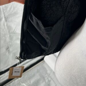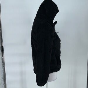 Soft black fleece jacket with front zipper. Perfect for warmth and comfort.