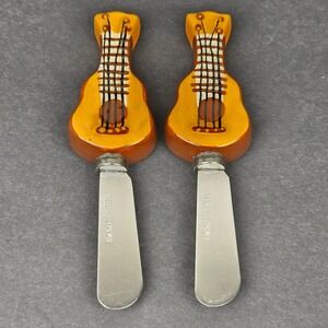 Hand-painted in vibrant orange and brown tones, the spoon rest showcases detailed string and fretboard accents. The spreaders feature stainless steel blades with coordinating ceramic ukulele handles.