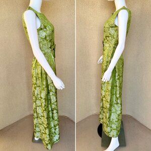 This handmade vintage 1950s–60s dress features a luxe silver rose jacquard brocade in a rich olive green, with a sleeveless scoop neckline, fitted bodice, and maxi skirt for a classic hourglass silhouette. Finished with a back zipper closure and a sewn-in front bow detail at the waist, the craftsmanship is exceptional, from the precise tailoring to the structured drape of the fabric. Pure romantic garden party energy with old-soul elegance, perfect for vintage romance, cottage soirées, and timeless feminine styling.