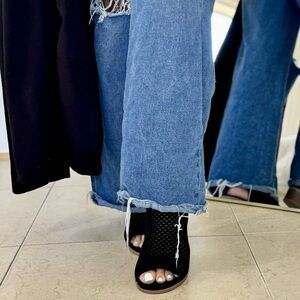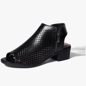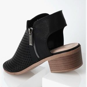 Chic black ankle booties with a stylish peep toe. Features a perforated design and a comfortable low block heel. Perfect for any occasion. Comes in original box with a dust bag for each shoe. These are excellent quality shoes. Vegan Nubuck.