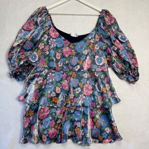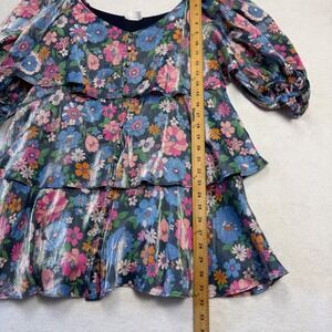 STORIA Womens Floral Tiered Puff Sleeve Mini Dress Metallic Blue Size L Cottage