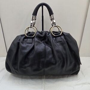 Well-crafted Bulga black leather shoulder bag featuring a structured silhouette and distinctive signature lining. Recently refreshed and styled with a modern silver braided handle for an updated look.