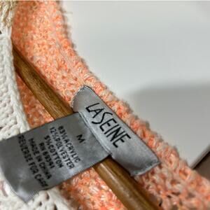 LaSeine women’s medium 3/4 sleeve sweater in a multicolored open knit. Features shades of pink, lavender, and cream in a loose weave, perfect for layering. Pullover style with a soft drape and slight stretch. A relaxed boho piece that works great for transitional weather or cool summer nights.