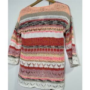 LaSeine Women’s M 3/4 Sleeve Open Knit Sweater Boho Multicolor Pink Cream