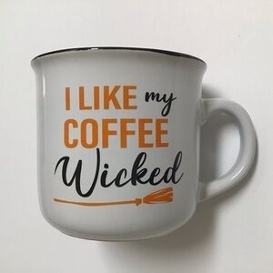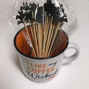 NEW with tag - Halloween Coffee Mug says “I Like My Coffee Wicked” Witch Broom Orange Black Cupcake Picks.