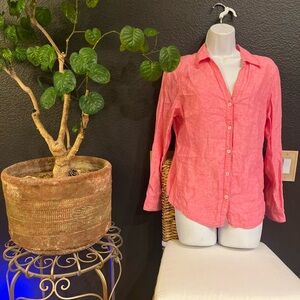Chic rose button-down shirt 100% Linen by Brooks Brothers. Features a classic collar and elegant buttons. Ideal for versatile styling.