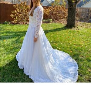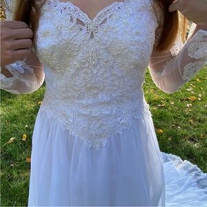 Absolutely gorgeous vintage 1970s lace sleeve wedding dress! Features elaborate beading and zip down back covered by non functional buttons. Beautiful lace sleeves for an elegant and timeless look! I intended to modify the waist to modernize it but ran out of time before my wedding. Very good condition for its age!