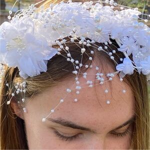 Satin with chiffon overlay and embroidered flowers. Pearl headpiece included.