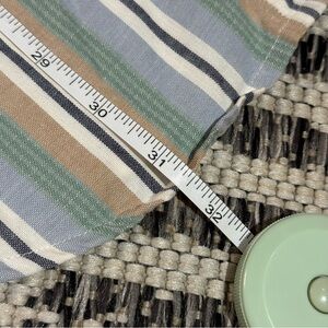 Features a classic collar and dual chest pockets. The fabric has a multicolor stripe pattern with blues greens tan and white.