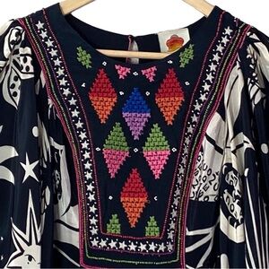 Farm Rio black and white Cerrado Sky maxi dress. Beautiful dress with a round neck, embroidered bodice, kimono sleeves, and beaded buttons. Please see pictures for more details and measurements.