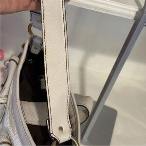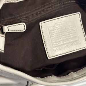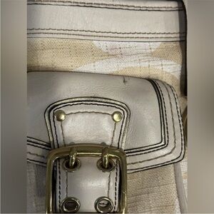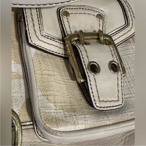 Coach Vintage shoulder bag in cream with gold accents. Features dual pockets and adjustable strap.