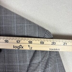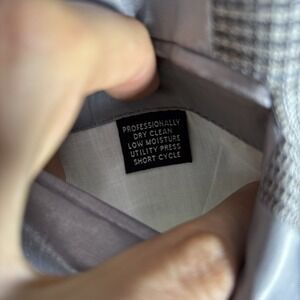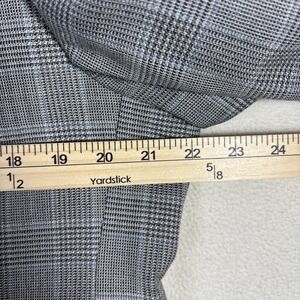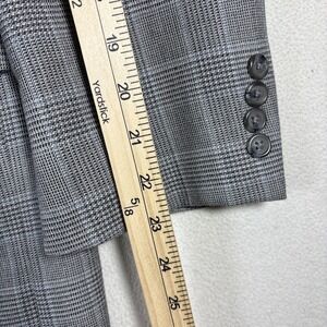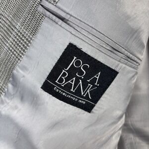 This Jos A Bank blazer for men in size 44S is a classic sport coat made of gray windowpane plaid wool. It features a two-button single-breasted front, double-vented back, and notch lapel. Ideal for various occasions like travel, weddings, parties, casual wear, or business events, this blazer also offers inner pockets and stretch for added convenience. Crafted with high-quality material and attention to detail, this blazer exudes a timeless elegance and sophistication. Perfect for all seasons, this blazer is a versatile and stylish addition to any man's wardrobe.