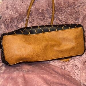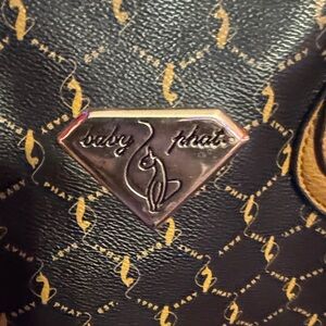 Elegant Baby Phat shoulder bag with a black and tan pattern. Features sturdy handles and a stylish design. 3 deep compartments small inside pocket zipper is broken. Soft leather and inside fabric no tear or wear