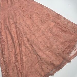 This elegant lace midi dress in a soft peach hue is perfect for any occasion. Its delicate design offers a timeless and sophisticated look.