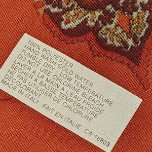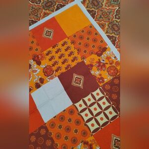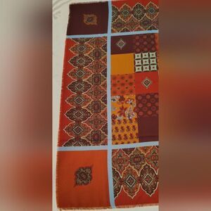 Vintage vibrant scarf with a patchwork design. Features red, orange, and brown patterns.
