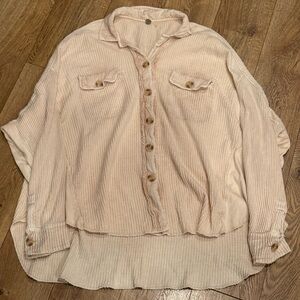 Stylish nude button-up shirt with a waffle knit texture. Features two front pockets and a relaxed fit. Wear it layered as a jacket or buttoned-up on its own as a shirt.