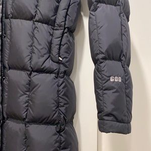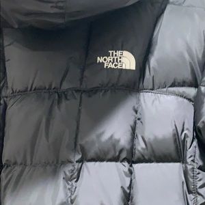 Long black puffer coat. Full zip closure. Hooded design. The North Face logo on chest.