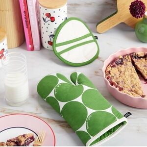 Kate Spade New York oven mitt and pot holder set in the iconic green dot pattern. Brand new with tags, never used. Bright, cheerful kitchen accessory that also makes a great gift.